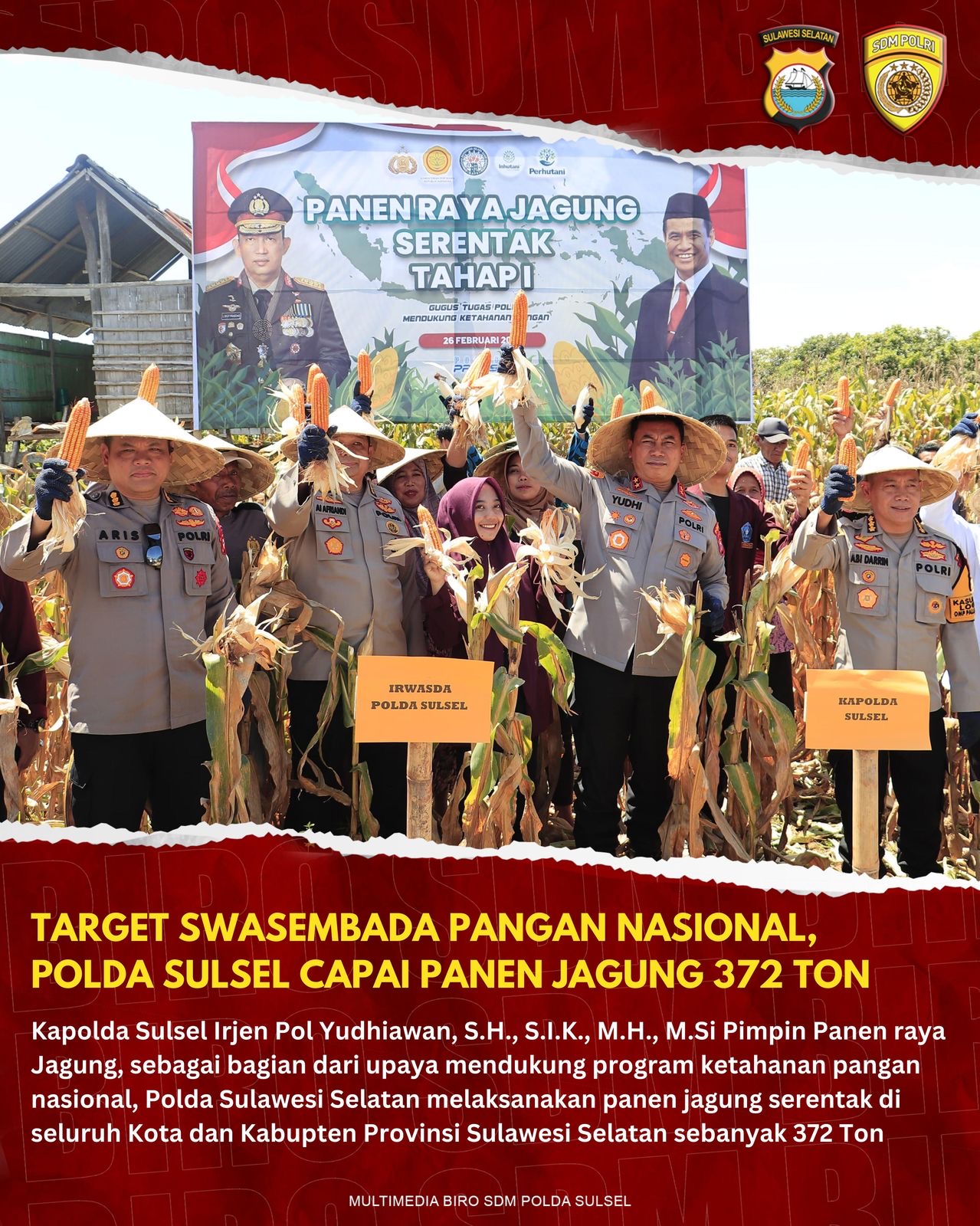 Kapolda Sulsel, Irjen Pol Yudhiawan, S.H., S.I.K., M.H., M.Si, memimpin langsung panen raya ini sebagai bagian dari upaya mendukung program ketahanan pangan yang dicanangkan pemerintah. Dengan semangat kebersamaan, jajaran Polda Sulsel bersama masyarakat berhasil memanen sebanyak 372 ton jagung di seluruh kota dan kabupaten di Provinsi Sulawesi Selatan.