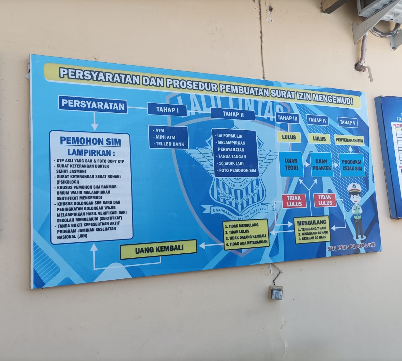 Papan informasi tersebut menampilkan tahapan secara jelas mulai dari persyaratan administrasi, proses pendaftaran, ujian teori, ujian praktik, hingga tahap pencetakan SIM. Setiap alur dibuat sederhana dan mudah dipahami, sehingga masyarakat dapat mengikuti seluruh proses tanpa kebingungan.