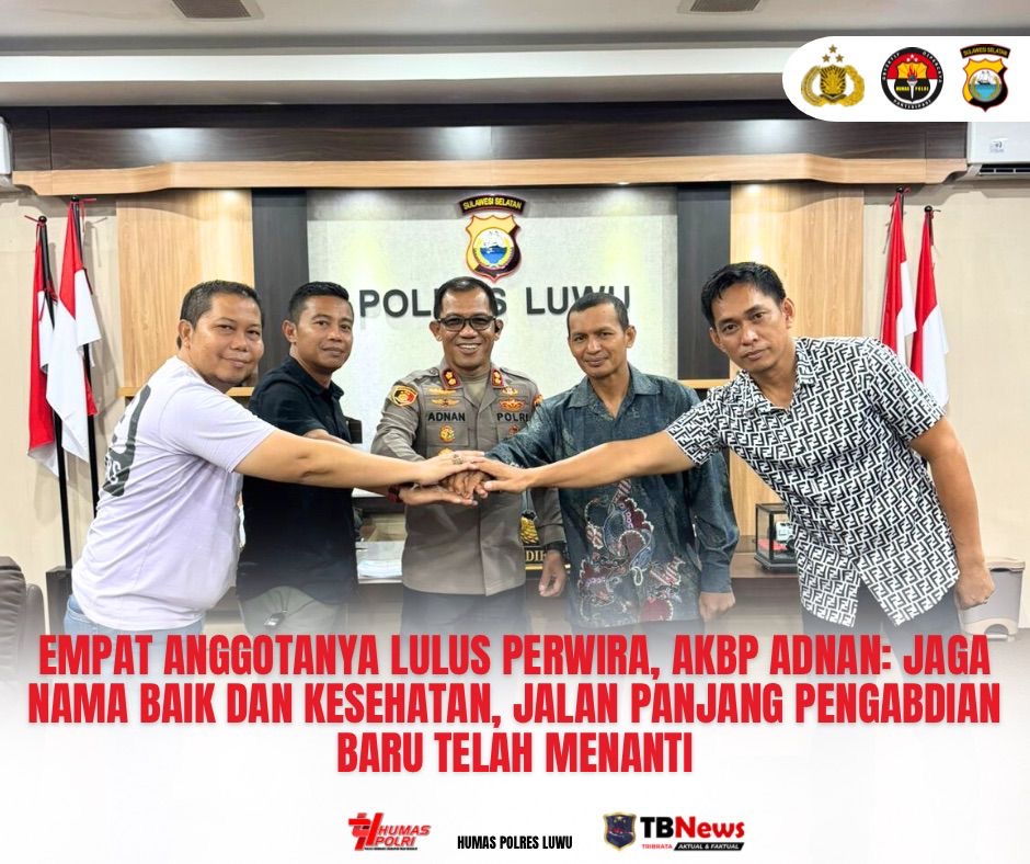 Kapolres Luwu AKBP Adnan Pandibu, S.H., S.I.K. menyampaikan apresiasi dan ucapan selamat kepada keempat anggotanya yang berhasil lolos seleksi. Ia berharap, keberhasilan tersebut menjadi inspirasi bagi personel lainnya di jajaran Polres Luwu.