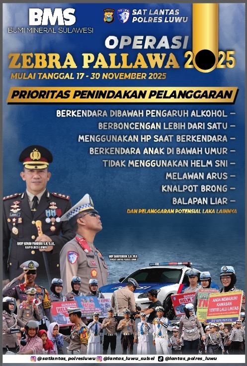 Tribratanewsluwu.co.id | LUWU – Polres Luwu melalui Satuan Lalu Lintas akan melaksanakan Operasi Zebra Pallawa 2025 yang digelar serentak di seluruh Indonesia mulai 17 hingga 30 November 2025. Operasi ini merupakan agenda nasional untuk meningkatkan kesadaran dan kepatuhan masyarakat terhadap aturan berlalu lintas serta menekan angka kecelakaan di seluruh wilayah hukum Polri.