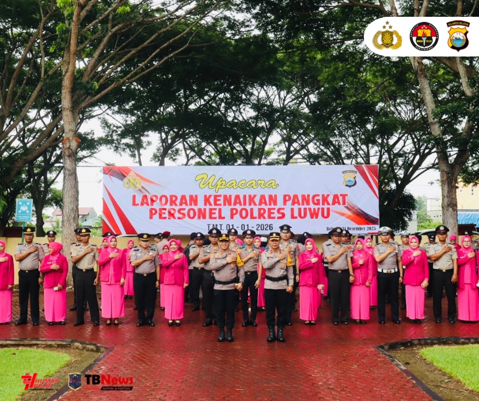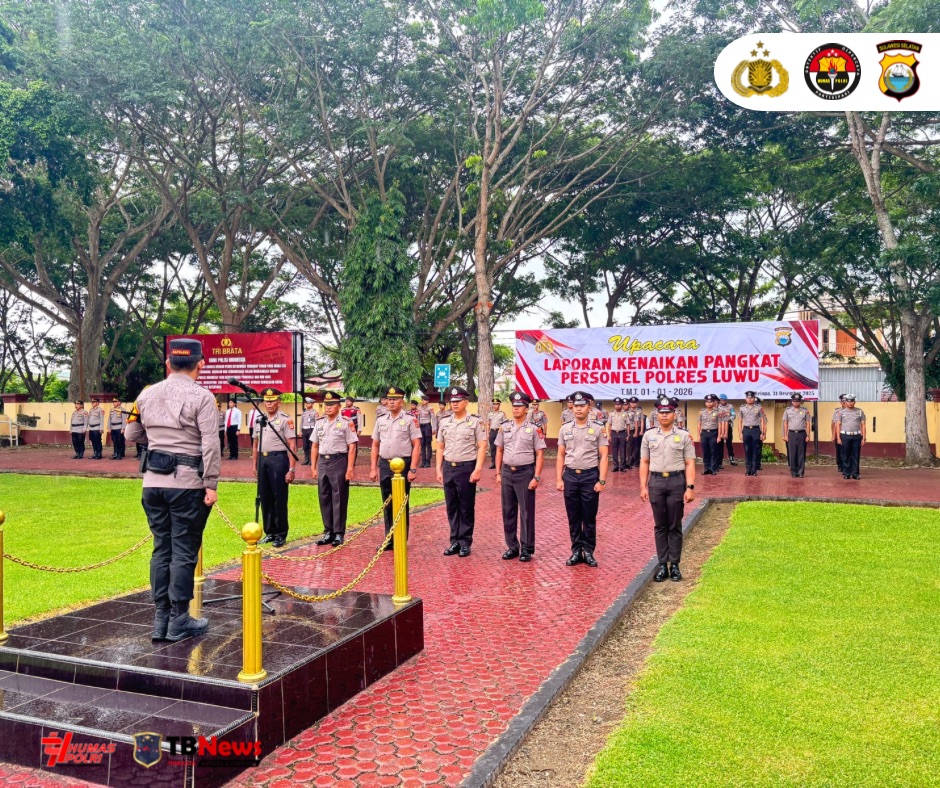 Tribratanewsluwu.co.id | Luwu — Kepolisian Resor (Polres) Luwu menggelar Upacara Laporan Kenaikan Pangkat personel periode TMT 1 Januari 2026 yang dipimpin langsung oleh Kapolres Luwu AKBP Adnan Pandibu, S.H., S.I.K., bertempat di lapangan apel Mapolres Luwu, Rabu (31/12/2025).