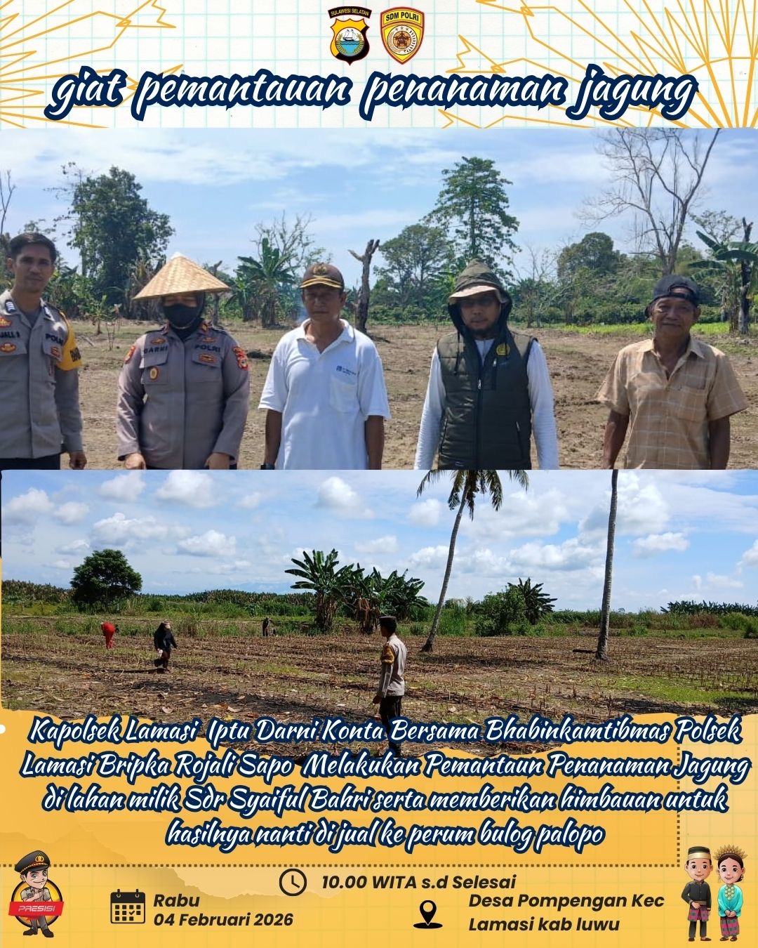 Tribratanewsluwu.co.id | Luwu — Dalam rangka mendukung program ketahanan pangan nasional, Polsek Lamasi Polres Luwu melaksanakan pemantauan kegiatan penanaman jagung binaan Polri di Desa Pompengan, Kecamatan Lamasi, Kabupaten Luwu, Rabu (4/2/2026).