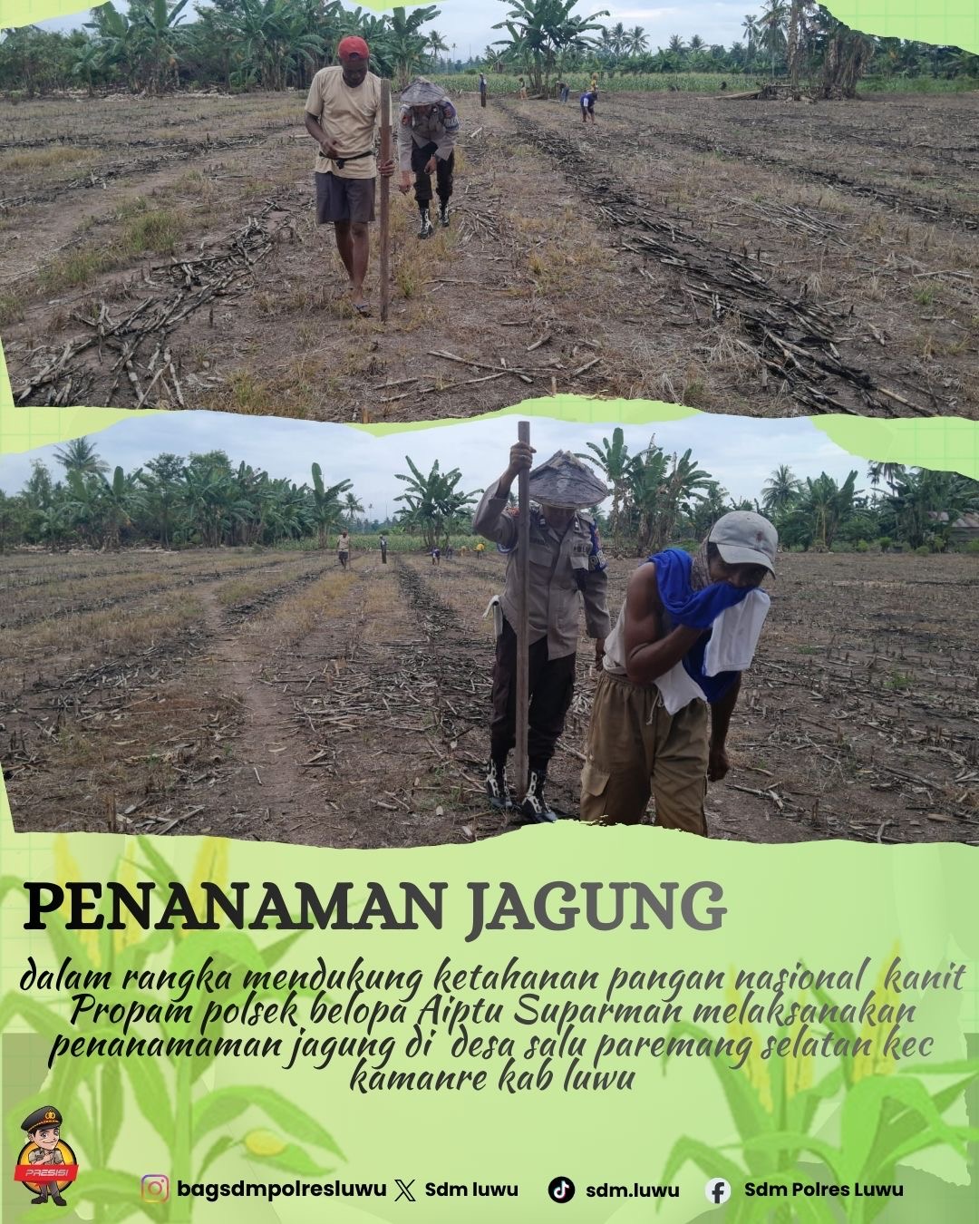 Tribratanewsluwu.co.id | Dalam rangka mendukung program swasembada pangan serta ketahanan pangan nasional, Polisi Penggerak Desa Saluparemang Selatan, Aiptu Suparman melaksanakan kegiatan penanaman jagung bersama Masyarakat dan Kelompok Tani pada Selasa (10/2/2025).