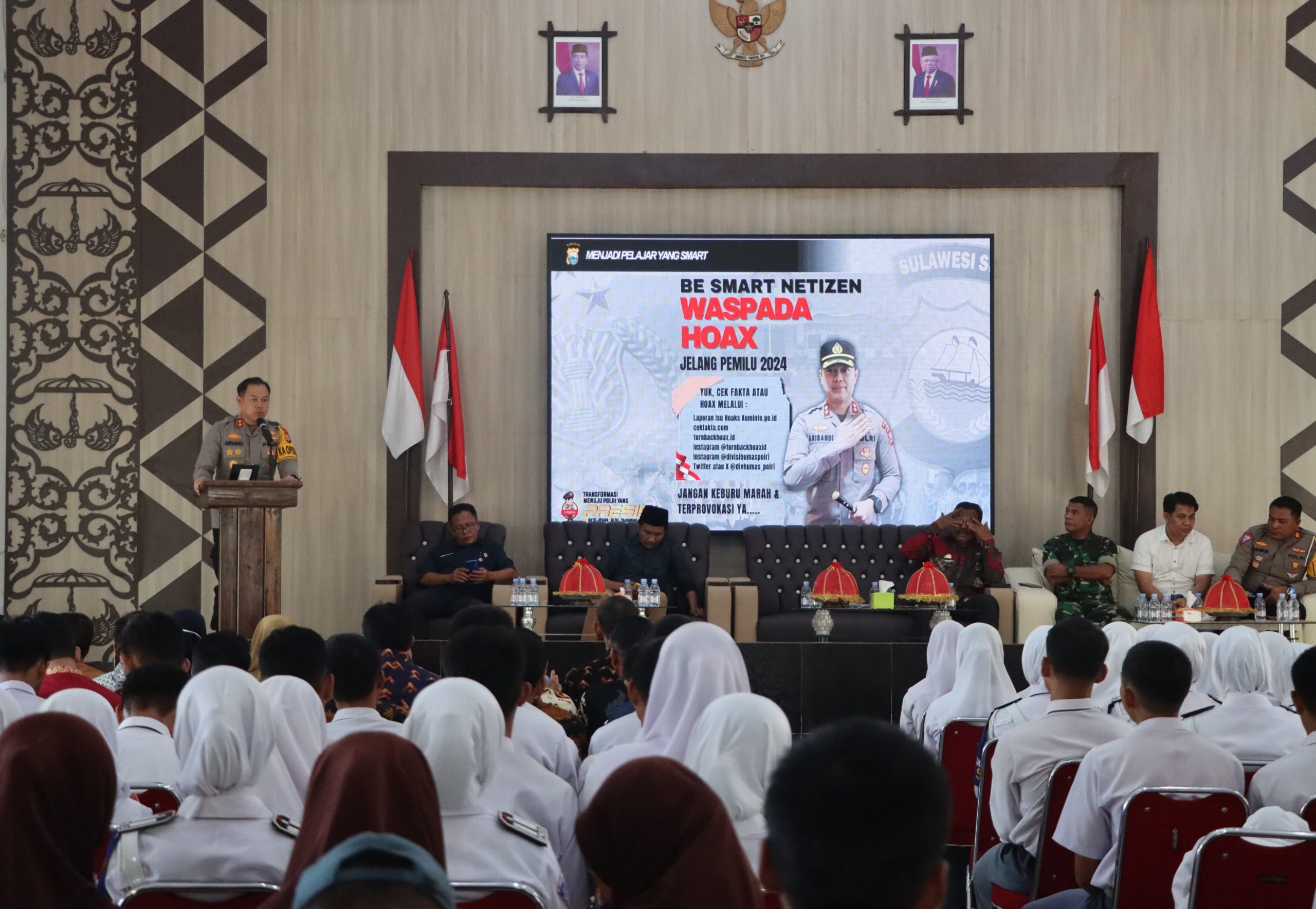 Kapolres Luwu AKBP Arisandi, S.H., S.I.K., M.Si. dalam paparannya menyampaikan peran penting dari seluruh siswa-siswi yang selain berpartisipasi aktif sebagai pemilih pemula, juga untuk bersama-sama menjaga situasi kamtibmas jelang Pemilu yang meliputi antisipasi terkait hoax, pornografi, cyber bullying dan cyber terorism.